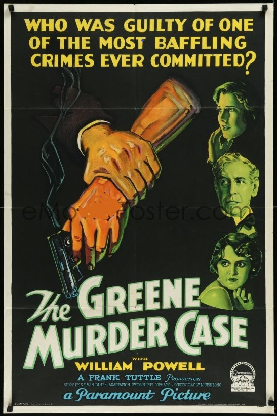 Greene Murder Case is a 1929 American pre-Code mystery film directed by Frank Tuttle and stars William Powell in his second Philo Vance outing, Florence Eldridge, and Jean Arthur. It is produced and released on August 11, 1929, by Paramount Pictures and based on the novel The Greene Murder Case, by S.S. Van Dine (Willard Huntington Wright). The novel had been published a year before this film was made.